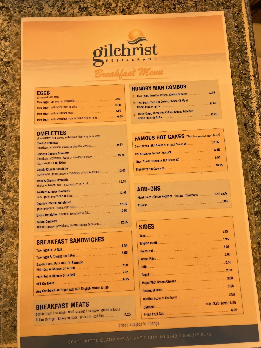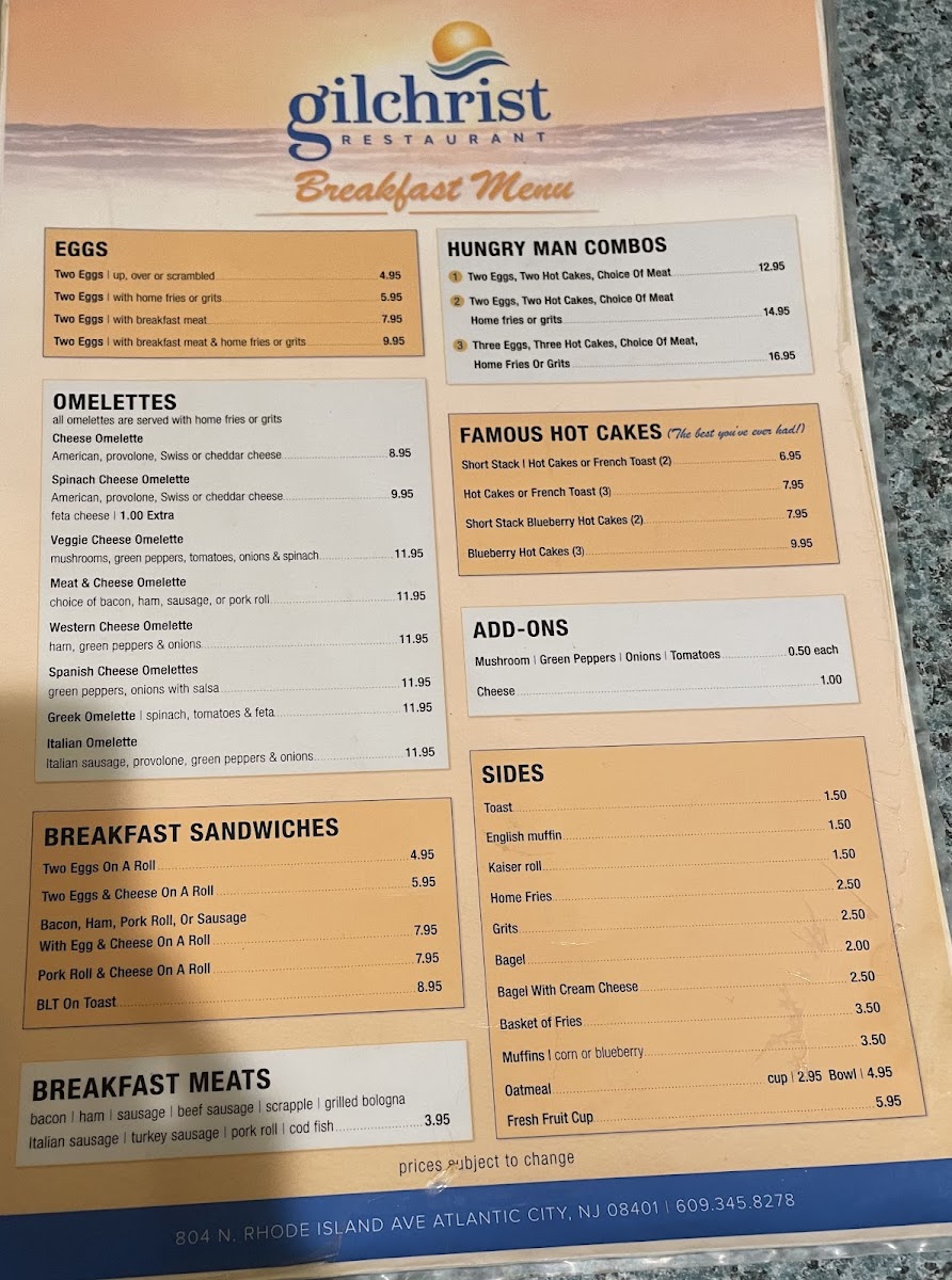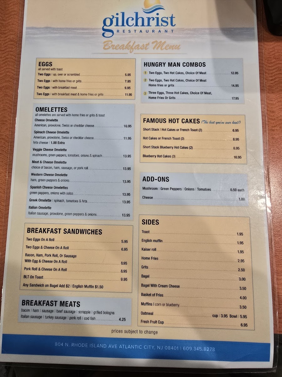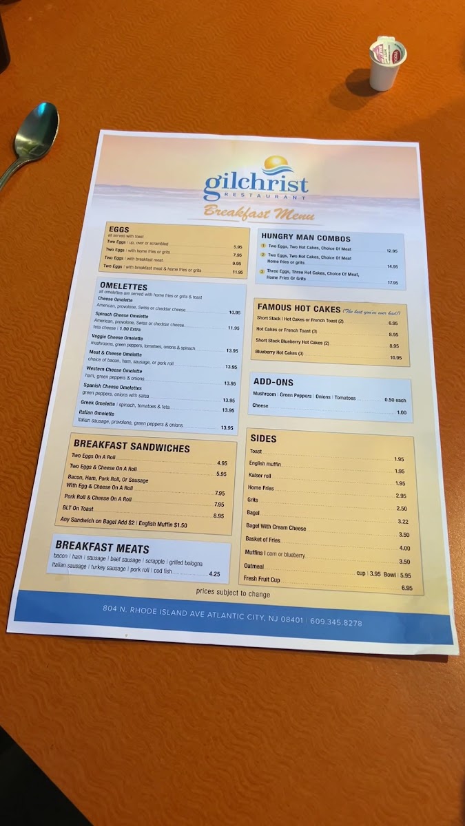 Welcome to Gilchrist Restaurant, a delightful breakfast haven tucked away at 804 N Rhode Island Ave in the vibrant heart of Atlantic City, NJ. This charming spot is not just a place to grab a meal; it's a destination for those who cherish the leisurely art of breakfast. With its picturesque location by the water, every visit offers a soothing ambiance, where the hustle and bustle of the nearby casinos fades into the background as you savor every bite.