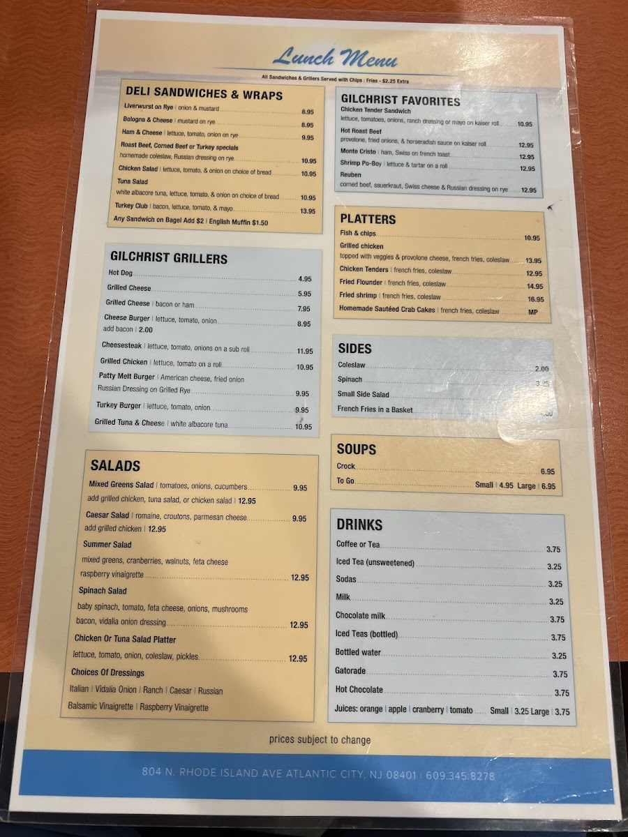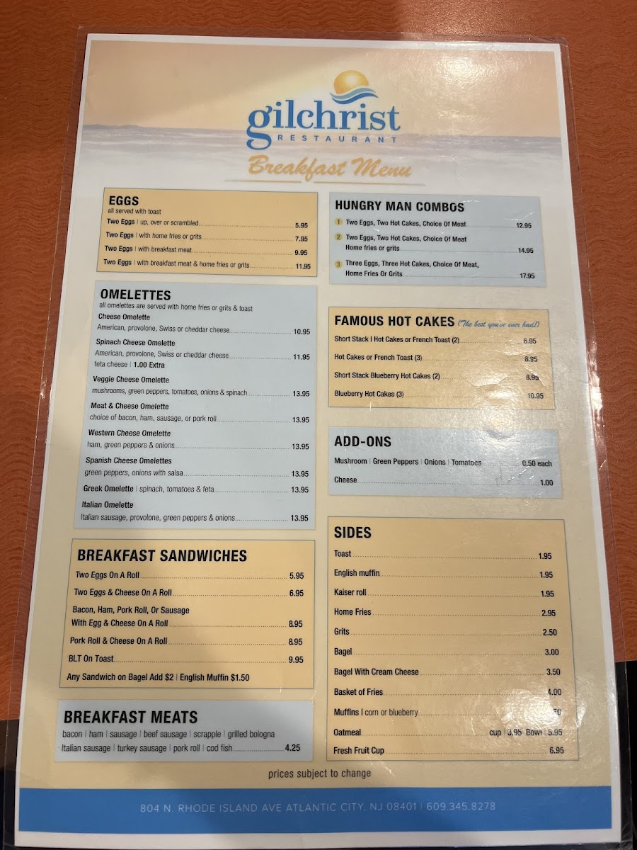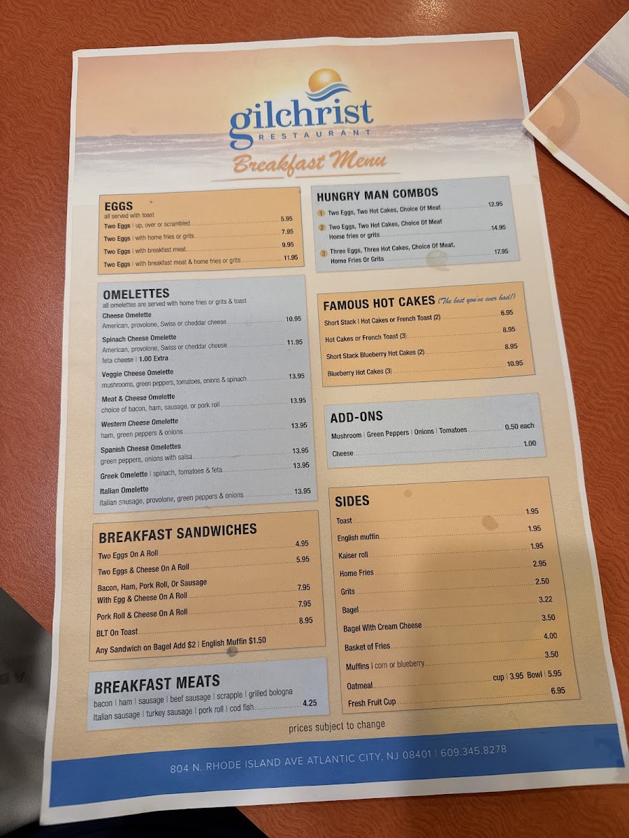Welcome to Gilchrist Restaurant, a delightful breakfast haven tucked away at 804 N Rhode Island Ave in the vibrant heart of Atlantic City, NJ. This charming spot is not just a place to grab a meal; it's a destination for those who cherish the leisurely art of breakfast. With its picturesque location by the water, every visit offers a soothing ambiance, where the hustle and bustle of the nearby casinos fades into the background as you savor every bite.