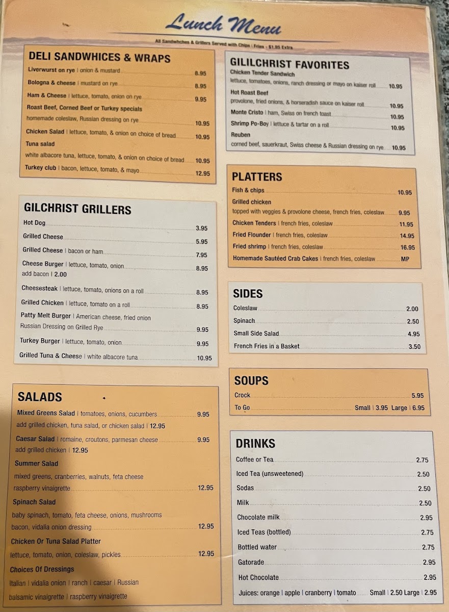 At Gilchrist, the breakfast offerings are as diverse as they are delicious. Start your day off right with their Hungry Man Combos, featuring classic choices like fluffy pancakes and perfectly cooked eggs, paired with hearty portions of your favorite breakfast meats. The Nova Lox Platter is a standout, and it’s perfect for those who crave a taste of the sea—served with fresh cucumbers, tomatoes, onions, and olives, alongside your choice of bagel, it’s a refreshing delight. And don’t miss out on their made-to-order waffles, which are fresh and hot, providing the perfect sweet touch to your morning feast.